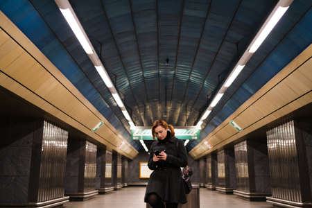 Redhead woman using phone texting in a Prague metro subway