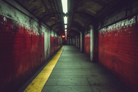 Empty subway station with red tiled walls leading to the distance