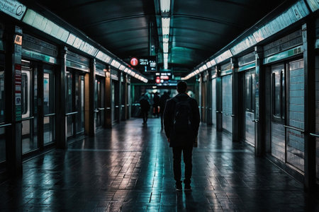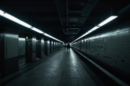A long, illuminated subway station platform stretches into the distance, creating a sense of depth and isolation.