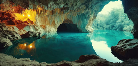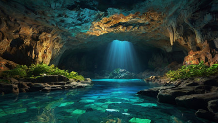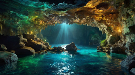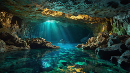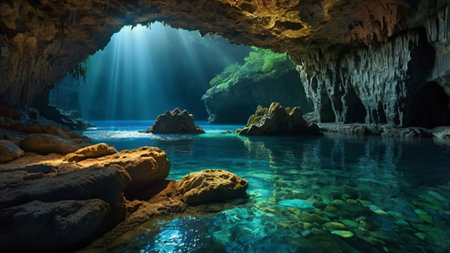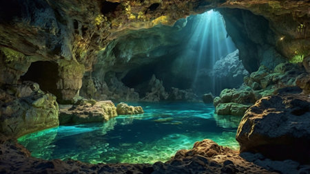 Cave with crystal clear turquoise water and sunbeams