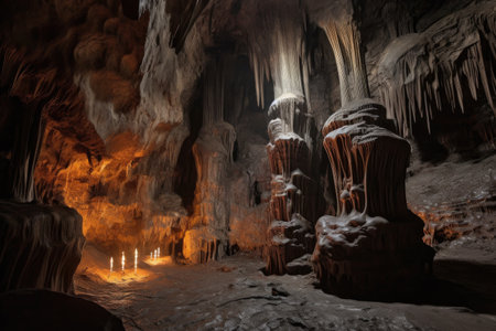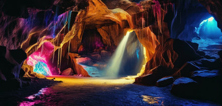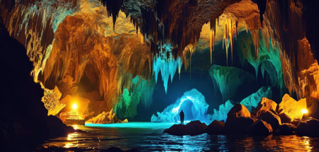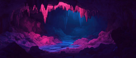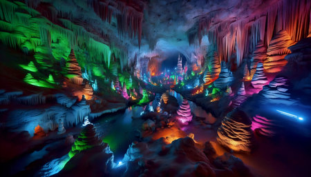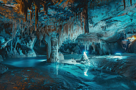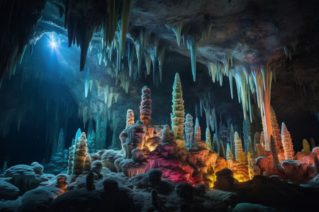 Illuminated stalactites and stalagmites creating a magical atmosphere inside a dark cave
