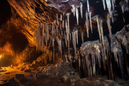 underground shot of stalactites with bats hanging from them, created with generative ai