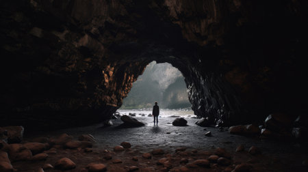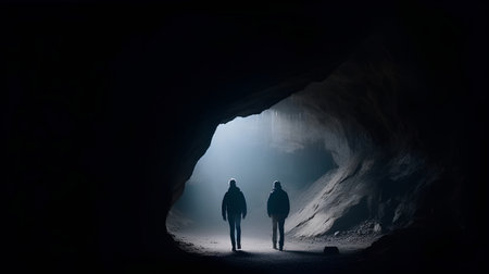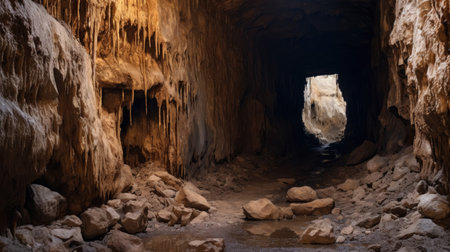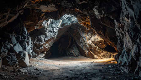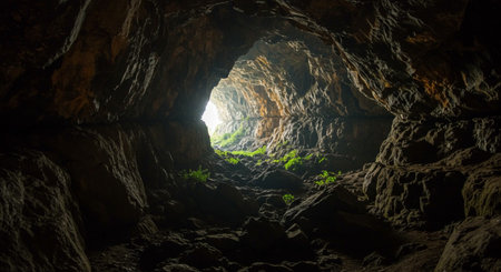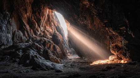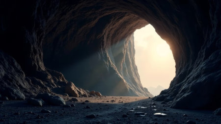 An interior view depicts a dark cave with rough textured walls and an opening that allows bright light to enter. The scene is defined by muted tones and a dramatic contrast between darkness and light. Suitable for use in conceptual projects or editorial purposes. The composition emphasizes depth and form.