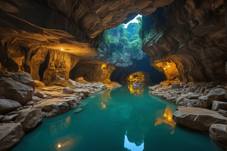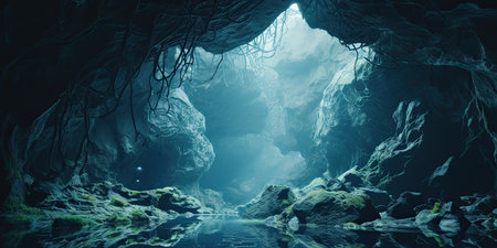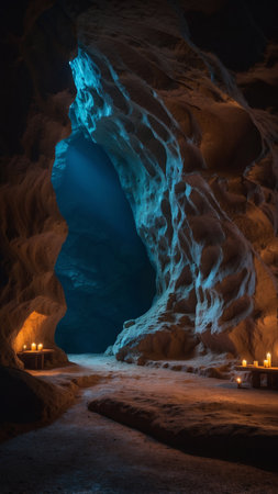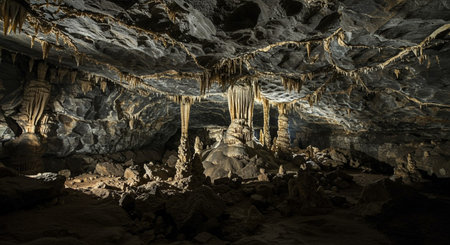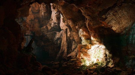 Discover the enchanting interior of a mysterious cave, featuring dramatic lighting and fascinating rock formations that create an atmosphere of intrigue and exploration.