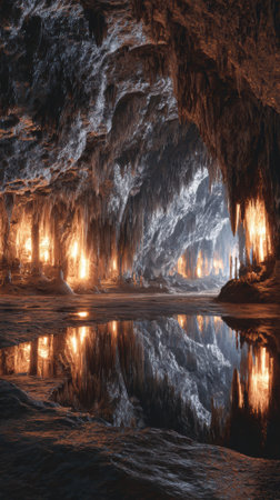 aetherpunk-inspired photograph showcasing the breathtaking beauty of a cave with intricate details. captured using the cinematic canon eos rebel t7 and a range of lenses, including 35mm, 50mm, 80mm, 100mm, and 200mm. this award-winning photo is rendered in hyper-realistic quality with stunning lighting, available in 8k, 16k, 4k, uhd, and hdr formats. experience the realism of this 12k photo. ai generated