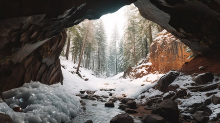 See of softening snow in a cave. Creative resource, AI Generated