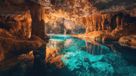 Explore the mesmerizing beauty of an underground cave featuring calm blue waters reflecting stunning stalactite formations in earthy tones.