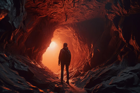 Dark cavern making deal. Red light cave and lonely man walking towards. Generate AI