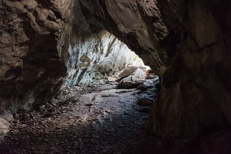 Beautiful cave. View from inside dark dungeon. Textured walls of cave. Background image of underground tunnel. Dampness inside cave. Lighting inside cave for excursions.