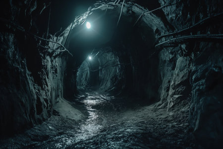Narrow underground tunnel system illuminating the coal mine with water on the ground