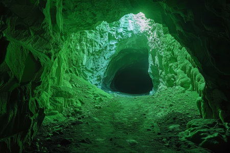 The mysterious entrance to an underground cave glows an eerie green from deep within the mountainside. What wonders and secrets await those who dare to venture inside