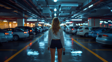 Blonde woman in business casual attire holds car keys while walking through a busy parking garage at night, showcasing city life and independence.