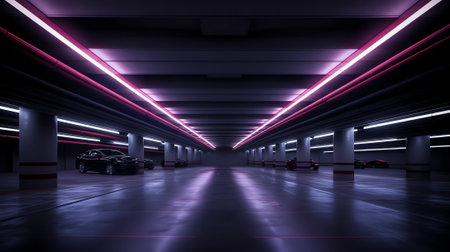 Parking garage underground interior, neon lights in dark industrial building, modern public construc