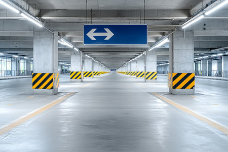 Spacious modern parking garage features clean lines and clear directional signage for vehicles. Ideal for urban infrastructure and commercial use.