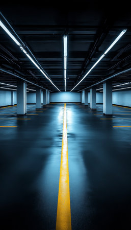 Spacious and Modern Parking Garage Interior with Bright Illumination and Clean Minimal Design
