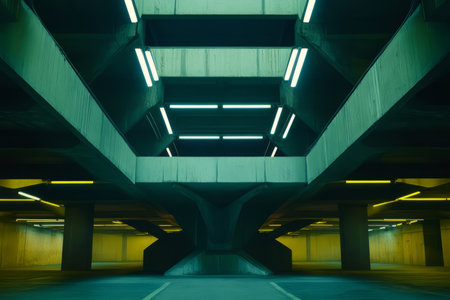 Modern Urban Underground Parking Garage Interior with Concrete Structure and Fluorescent Lighting