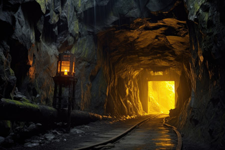 eerie tunnel lit by a lantern in a mine shaft, created with generative ai