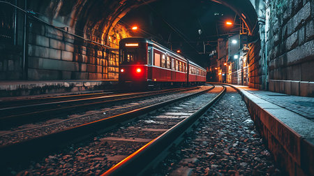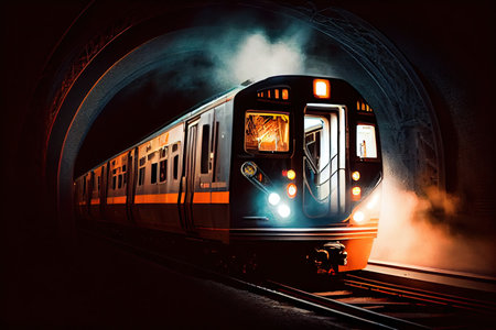 A dynamic view of a subway train entering a dark tunnel, with lights illuminating the tracks and creating a dramatic atmosphere of urban transit.
