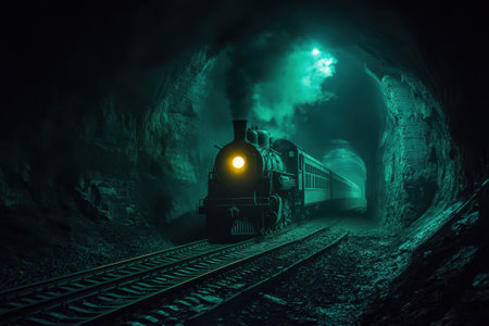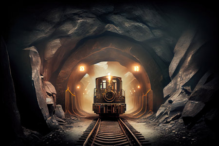A captivating scene of a train entering a dark mine tunnel, illuminated by bright lights. The image showcases the contrast between light and shadow in an industrial setting.