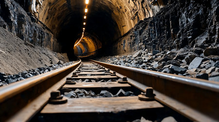 Abandoned railway tunnel with rusty tracks fading into the darkness, linear symmetry drawing the eye inward