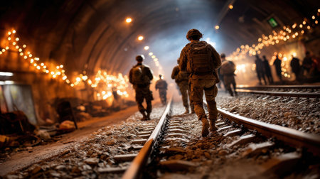 A nighttime shot of a subway tunnel with illuminated signs and safety lights, creating a sense of motion and urgency in the underground environment
