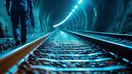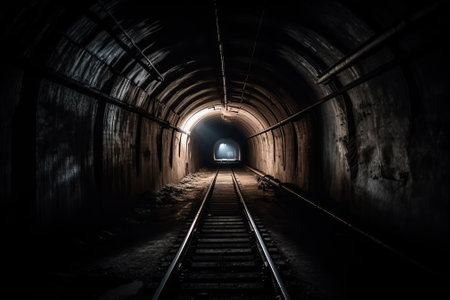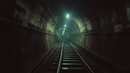 A dramatic shot of train tracks leading into a long, dark tunnel, highlighting the mystery and anticipation of underground travel.