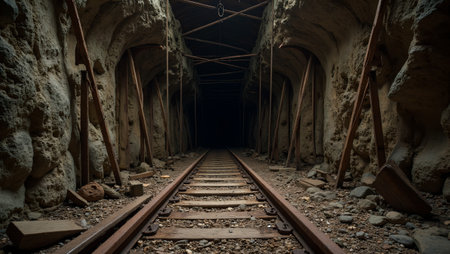 Eerie abandoned mining tunnel with rusty rails and broken equipment