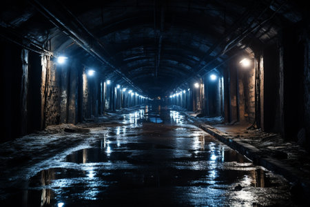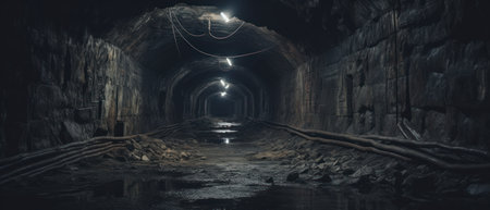 Haunting mine tunnel, with dim light casting eerie shadows on the damp rock walls of an abandoned underground passage.