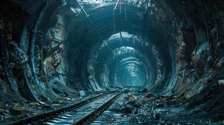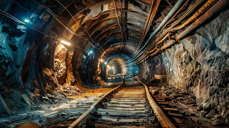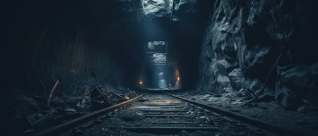 Dark underground mining tunnel with rail tracks illuminated by industrial lights. Mining industry concept