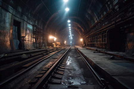 Eerie underground tunnel with abandoned train track, shrouded in mystery. AI generative.