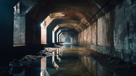 Dimly lit tunnel, its eerie ambiance accentuated by a distant red glow. AI generative.