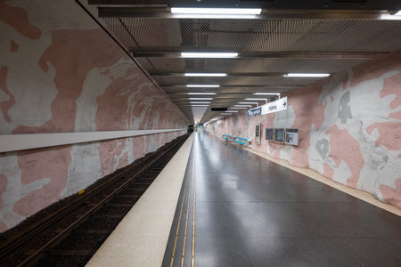 Sweden, Stockholm - Aug 6, 2024: Historic metro station carved in the rock in the city center - Morby Centrum Station. Northern Europe (Morby Centrum)