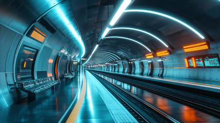 Modern train station features illuminated tracks and minimalist design, creating a captivating atmosphere.