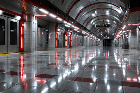 A gleaming, empty subway platform with red accents and bright lights