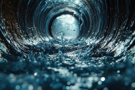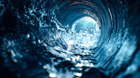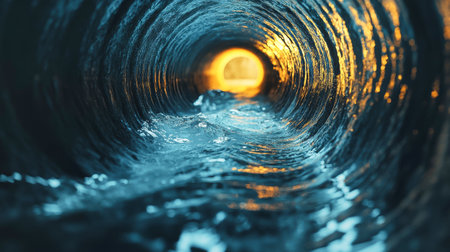 An abstract depiction showcases water cascading through a circular pipe. The scene is dominated by shades of blue, with light suggesting motion. The composition, captured from a low angle, allows for varied commercial use, suitable for concepts related to flow or infrastructure.