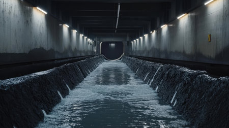 A captivating view of a dark underground water channel with flowing water, concrete walls, and illuminated industrial lights, emphasizing depth and atmosphere.
