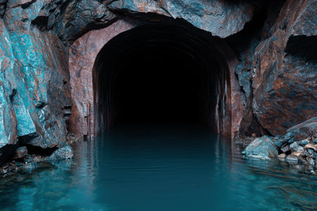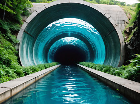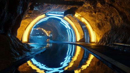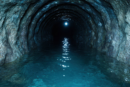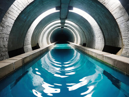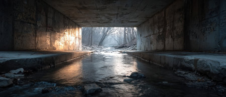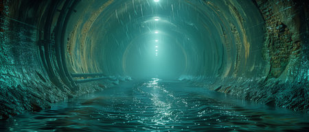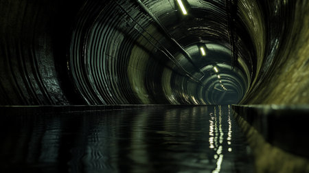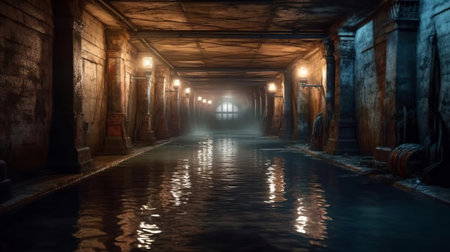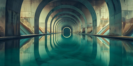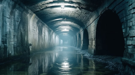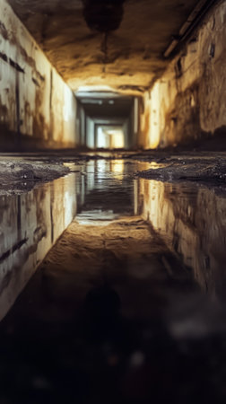 Abandoned industrial tunnel with water reflections, eerie and mysterious concept