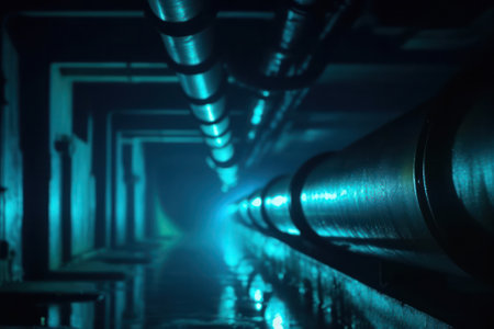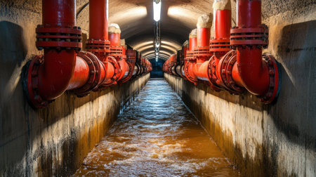 Water flows from industrial pipes in a dark and humid service tunnel, creating a dramatic scene of infrastructure and resource management