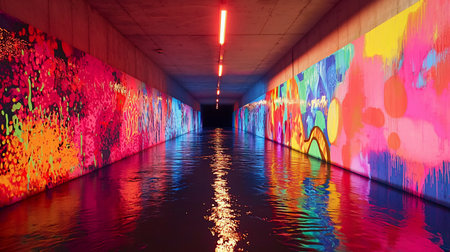 Behold a magnificent glowing water tunnel that beautifully showcases vibrant reflections and enchanting light play