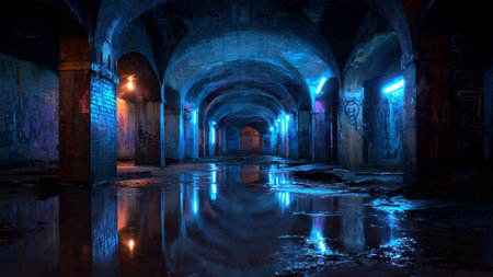 Mysterious underground vault with arches, columns, and water reflections illuminated by blue and orange lights. Urban exploration.