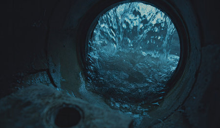 A captivating image of water flowing through a dark pipe, creating enchanting bubbles and ripples. The scene captures the dynamic motion and beauty of liquid in an underwater setting.