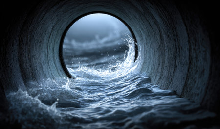 This compelling image captures the dynamic flow of water through a concrete tunnel, with waves crashing and natural light filtering in, evoking a sense of adventure.
