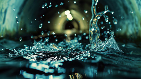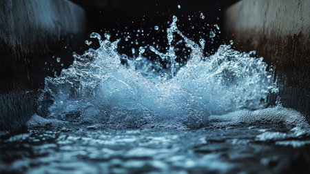 Captivating close-up of water droplets splashing in an industrial channel, showcasing dynamic motion and shimmering reflections on the surface.