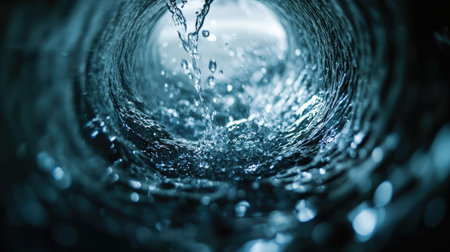 This stunning image captures the dynamic motion of water swirling within a dark tube, showcasing splashes and ripples that evoke a sense of energy and fluidity.