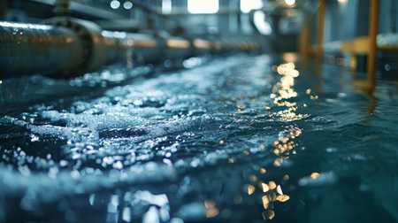 Detailed close-up of water flowing in a modern water treatment plant, showcasing the purity and movement of water with a blue color palette.