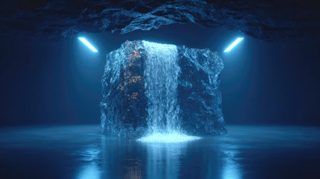 Futuristic cave with waterfall in blue light. 3D rendering