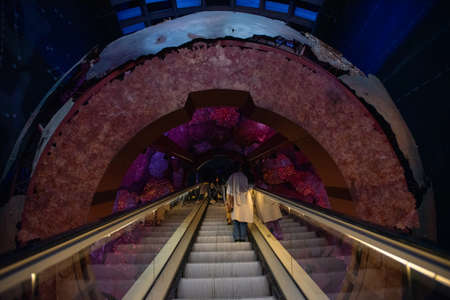 Escalators inside the Roosevelt Island Subway Station, in Manhattan, New York.