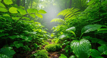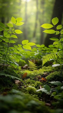 Captivating close-up of lush green foliage on the forest floor, illuminated by soft light, creating a serene and tranquil atmosphere perfect for nature-themed projects.
