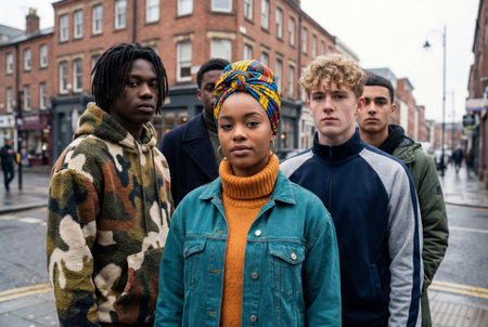 Five young multicultural friends stand confident together on a city street with serious expressions while wearing trendy urban fashion and colorful warm jackets.