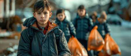 Young boy collecting trash in rural area during daytime community cleanup